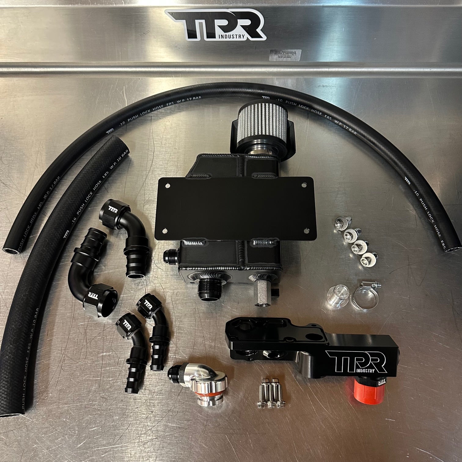 Breather tanks in Pro XP, Turbo R, RS1 and universal kits will come with a flat plate welded on the back and will include all AN fittings and hose necessary for those applications.